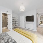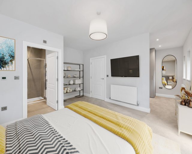The executive master bedroom features a dedicated dressing area with fitted wardrobes and a sleek en-suite, complete with a mirrored cabinet and chrome heated towel rail. Two additional generously sized bedrooms and a modern main bathroom perfectly complement this stunning home.