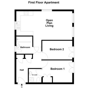 Located on the first floor, the apartment boasts a bright and airy feel, enhanced by large windows that allow an abundance of natural light to flow through the living spaces. The heart of the home is the spacious open-plan kitchen, dining, and lounge area, thoughtfully designed to create a flexible and sociable environment ideal for both everyday living and entertaining guests. The contemporary kitchen is well laid out with ample worktop, integrated appliances and storage space.