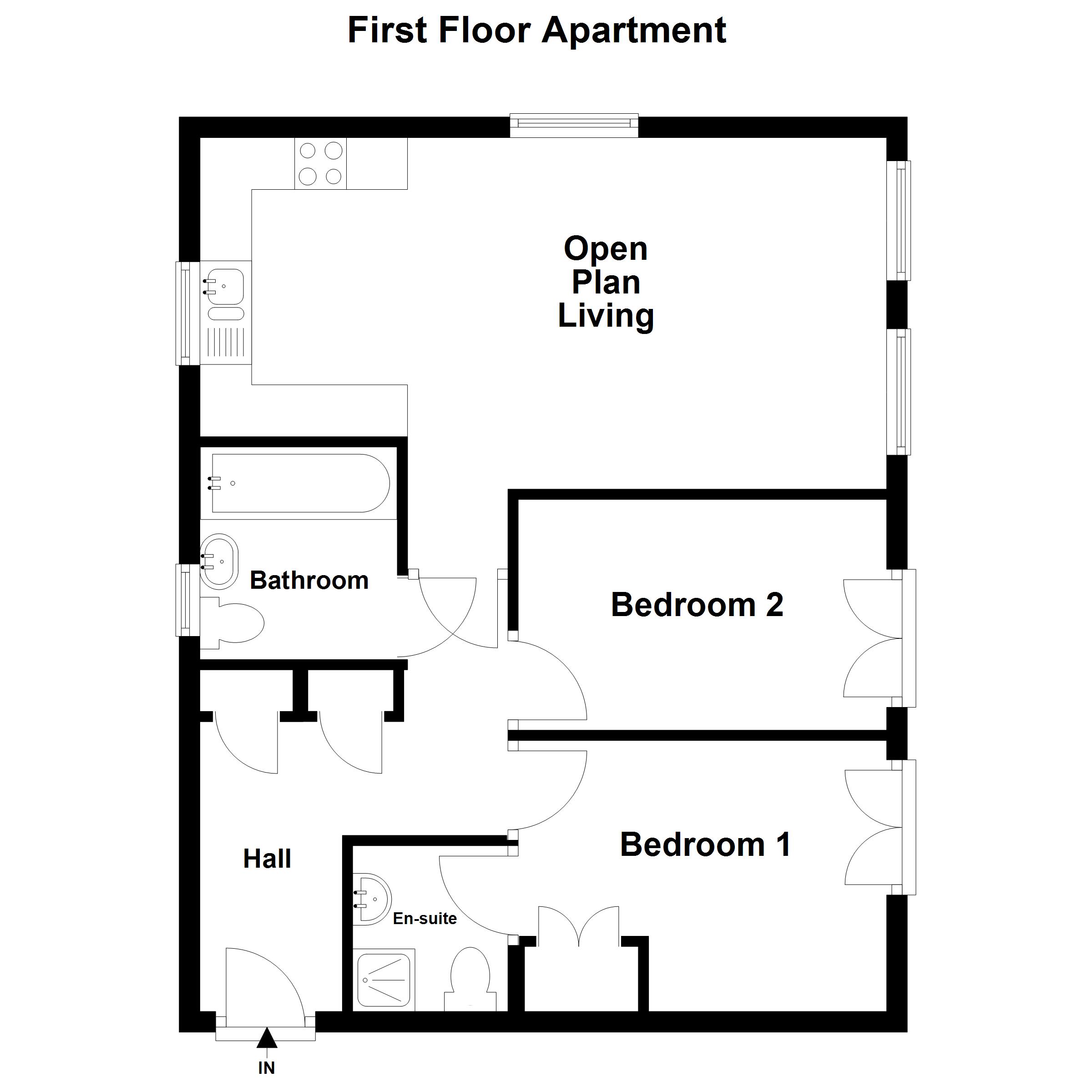 Located on the first floor, the apartment boasts a bright and airy feel, enhanced by large windows that allow an abundance of natural light to flow through the living spaces. The heart of the home is the spacious open-plan kitchen, dining, and lounge area, thoughtfully designed to create a flexible and sociable environment ideal for both everyday living and entertaining guests. The contemporary kitchen is well laid out with ample worktop, integrated appliances and storage space.