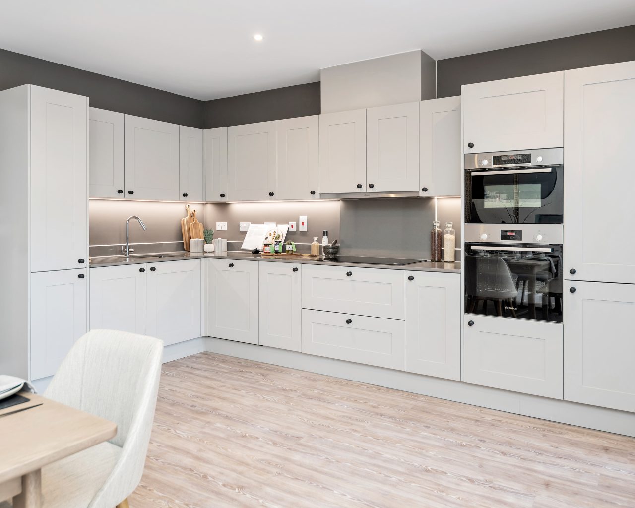 The sleek modern kitchen comes fully equipped with integrated appliances, including a fridge freezer, hob, and dishwasher, all set against tasteful cabinetry and quality worktops. The adjoining dining and family areas offer plenty of space for relaxing, entertaining, or spending time with loved ones, all set on hard-wearing and stylish Amtico flooring for easy maintenance and timeless appeal.