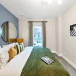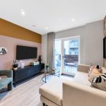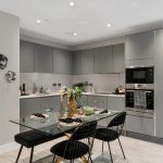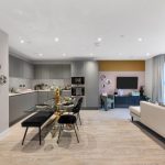 The heart of the home is the open-plan kitchen, dining, and living area, which creates a bright and spacious environment ideal for entertaining or relaxing. A private balcony extends the living space, offering an inviting outdoor area. The sleek matt-finish handleless kitchen units with soft-close drawers provide a sophisticated touch, complemented by integrated appliances, including a single oven, microwave, dishwasher, and fridge/freezer, ensuring effortless convenience.