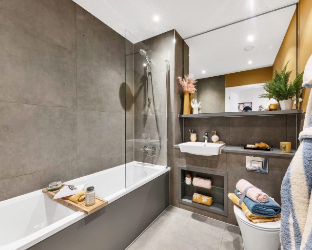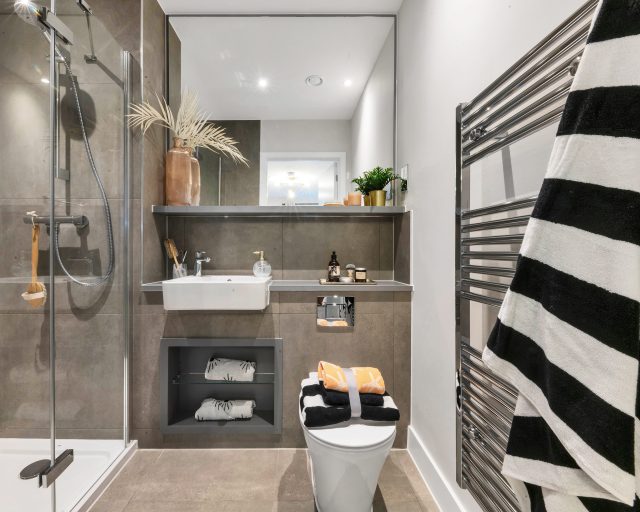 The bathroom is fitted with heated chrome towel rails, adding a touch of luxury and warmth. Additionally, the apartment features underfloor heating throughout, ensuring a cozy and energy-efficient living environment.