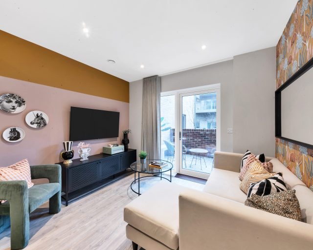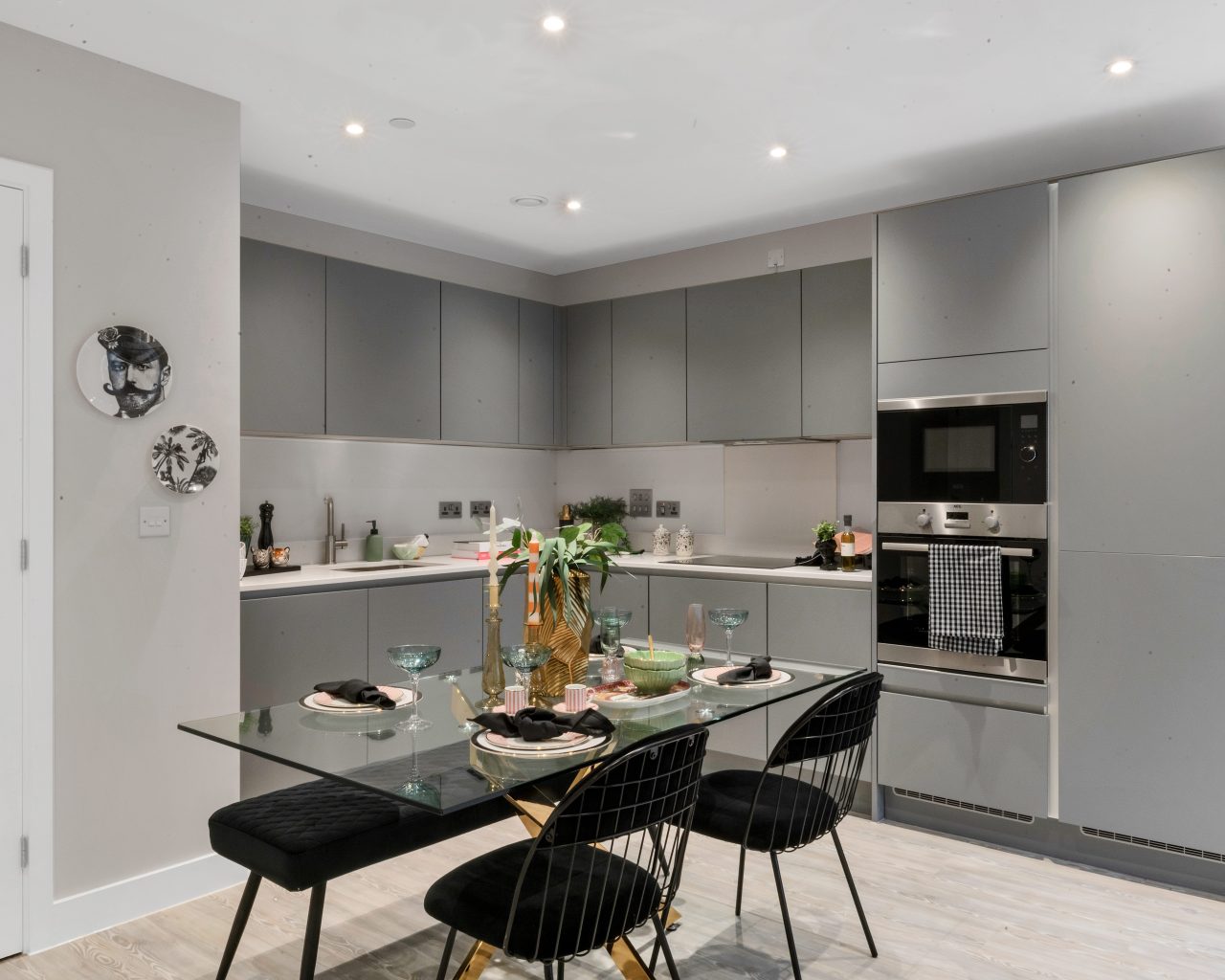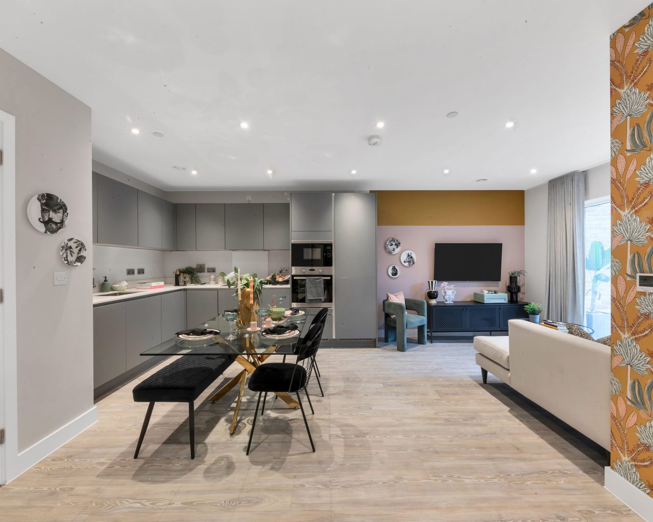 The heart of the home is the open-plan kitchen, dining, and living area, which creates a bright and spacious environment ideal for entertaining or relaxing. A private balcony extends the living space, offering an inviting outdoor area. The sleek matt-finish handleless kitchen units with soft-close drawers provide a sophisticated touch, complemented by integrated appliances, including a single oven, microwave, dishwasher, and fridge/freezer, ensuring effortless convenience.