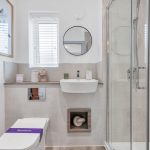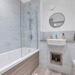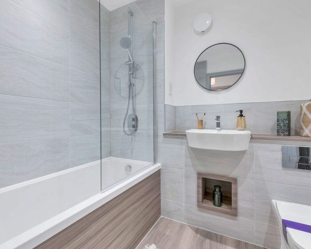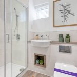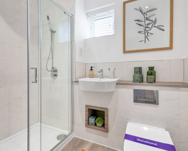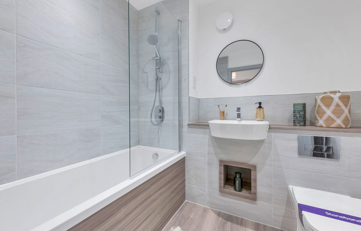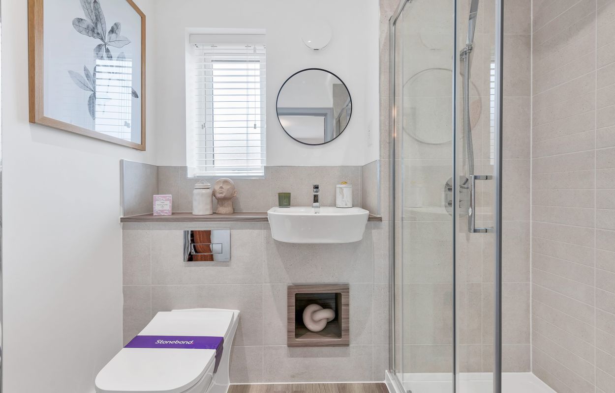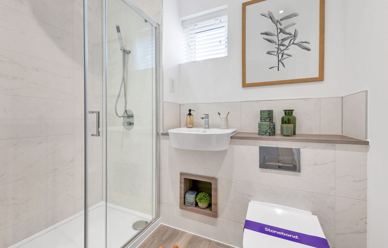 - Contemporary bathrooms include white sanitaryware, chrome brassware, half-height wall tiling, rainfall showers in the en-suite and heated towel rails